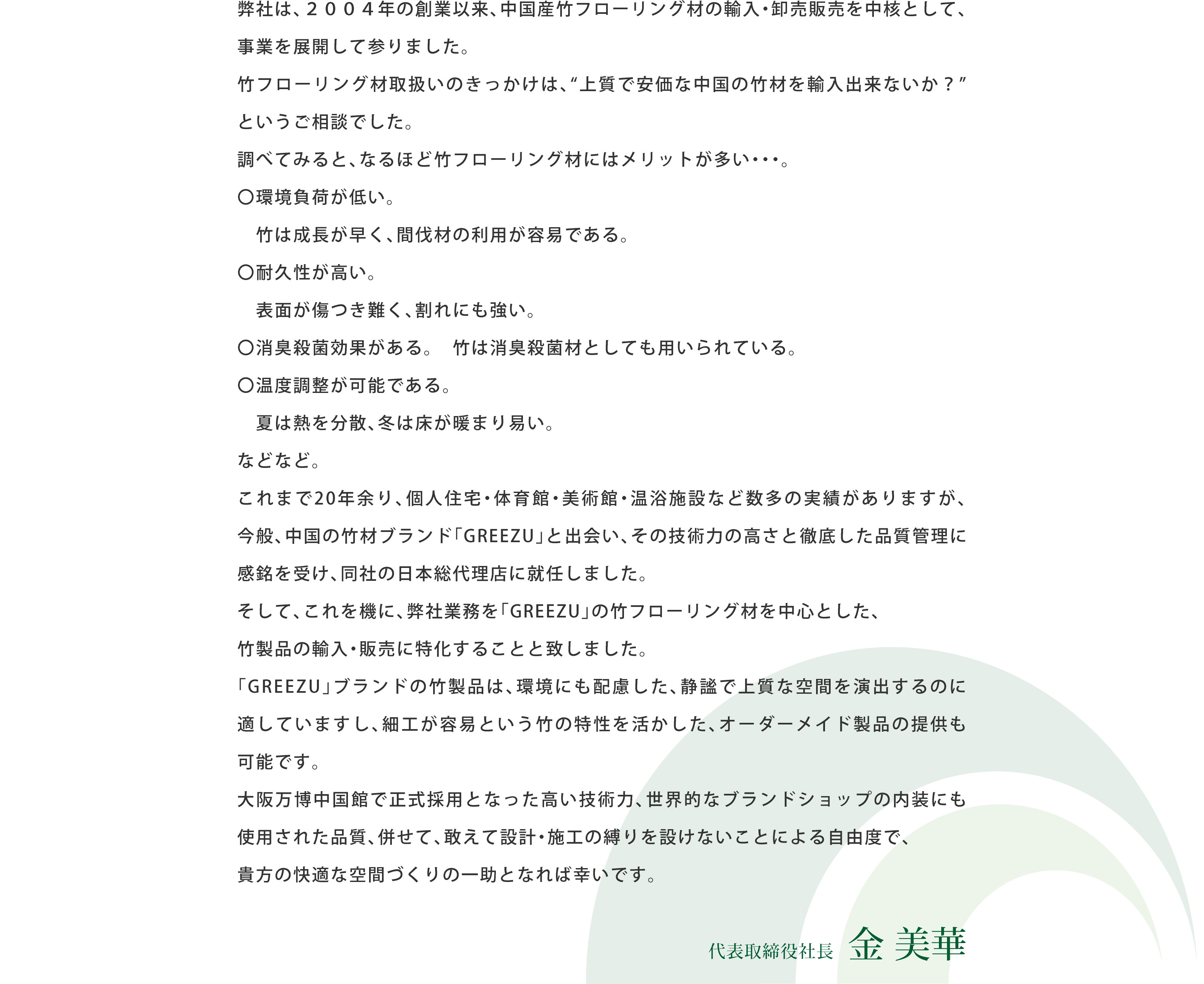 「GREEZU」ブランドの竹材は、環境への配慮、高い耐久性が特徴であり、大阪万博中国館でも正式採用され、上質な空間づくりに貢献しています。
